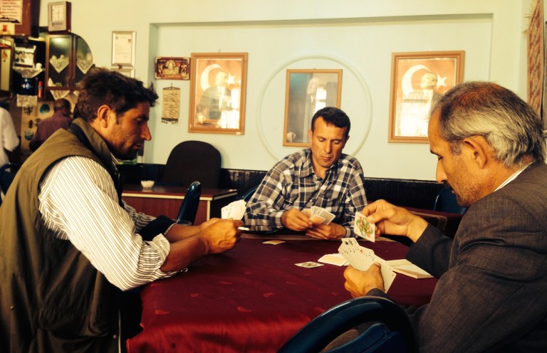 It is within teahouses that much of the city’s heart and soul resides. Men with faces carved from the earth, their hands chiselled from rock, puff on cigarettes beneath ‘no smoking’ signs, the walls behind them adorned with photographs of Atatürk; the father of modern, secular Turkey. Frayed flat caps, grey suits, playing cards, red velvet tablecloths and dusty wooden floors lend themselves to an atmosphere of humble simplicity. Wood is everywhere. Wooden chairs, wooden panelling, wooden tables with cigarette burns and the circular imprints of hot thin-waisted tea glasses. To our left and right, groups of men play cards as a shoeshine boy seeks our business. Behind him, an old man, his cap pushed towards the back of his head, enters the room and places two bags of bread and tomatoes on the floor beside him. It is our first tea of the day.